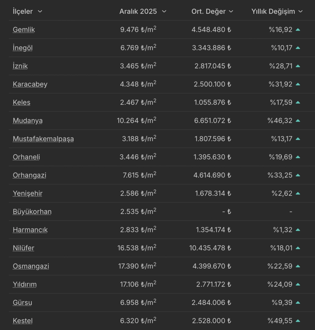 en fazla değer kazanan ilçeler sırasıyla Mudanya, Kestel, Orhangazi, Karacabey, İznik oldu. Bursa'da arsa ve arazi fiyatları en az artan ilçeler Ortalamalara bakıldığında Aralık 2025 sonu itibarıyla konut imarlı arsa için Bursa'da