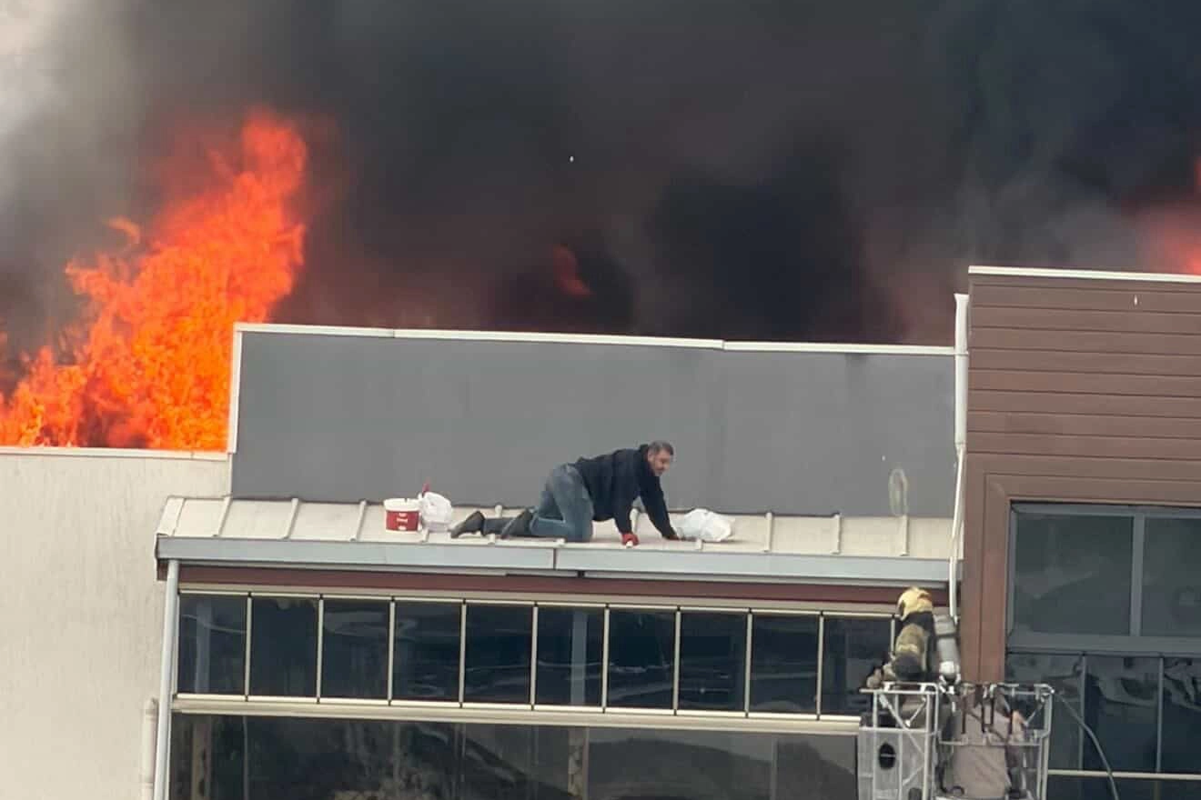 Yangında mahsur kalan bir çatı ustası ile dumandan etkilenen başka bir çalışan için zamanla yarış başladı. Kendini dışarıya atan kişi çatının ucunda kurtarılmayı bekledi. Bursa Büyükşehir Belediyesi'nin 40 metre merdivenli aracı mahsur kalan kişiyi kurtardı. Dumandan da etkilenen başka bir kişiye de 112 ekibi müdahale etti.