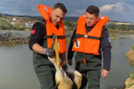 Kısa sürede bölgeye ulaşan ekipler, suya uygun özel kıyafetlerini ve can yeleklerini giyerek kurtarma çalışması başlattı. Zorlu şartlarda gerçekleştirilen çalışmada, çalılıklar arasında sıkıştığı belirlenen yaralı pelikan bulunduğu yerden dikkatli bir şekilde çıkarıldı.