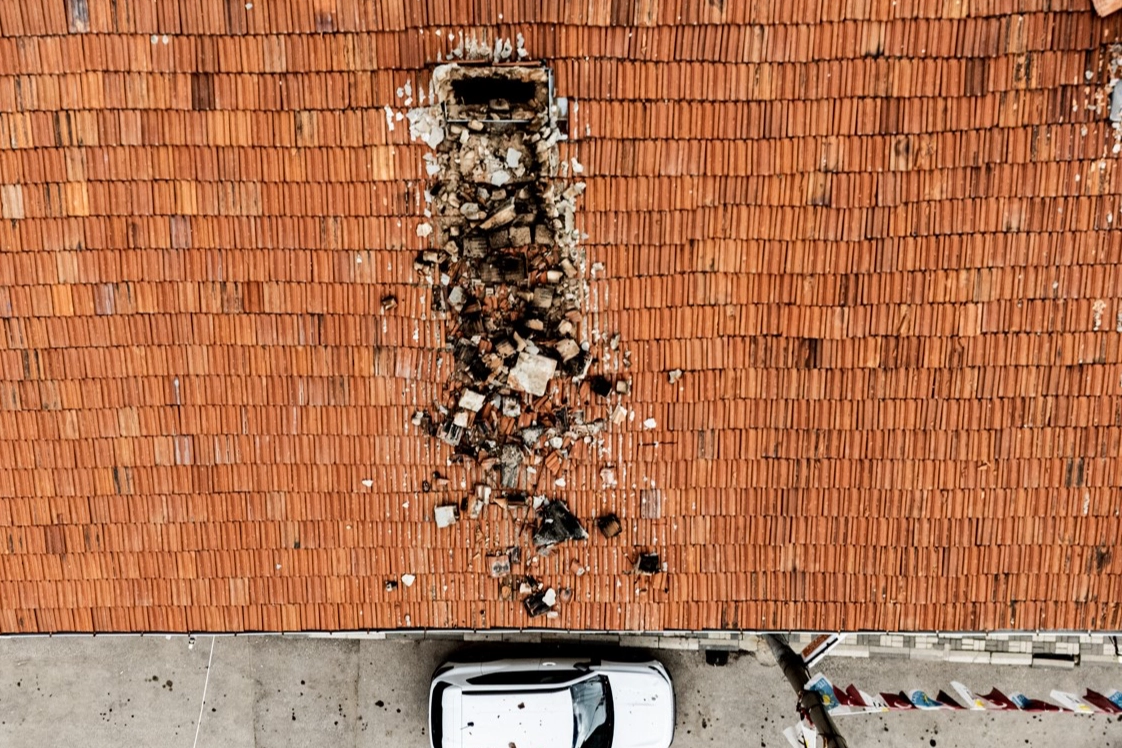 Bacadan kopan beton ve tuğla parçalar evin önünde yol üzerinde park halinde bulunan 16 BZP 165 plakalı otomobilin üzerine düştü. Şans eseri yolun boş oluşu facianın önüne geçti.