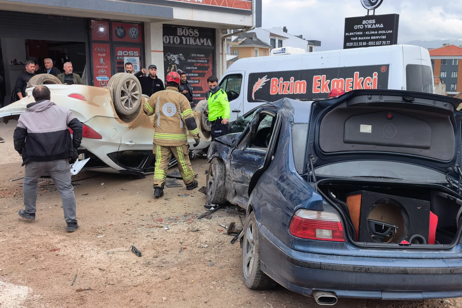 Yoldan savrulan otomobil, oto yıkama işyeri önünde park halinde bulunan 16 AFH 829 plakalı otomobile, 16 BTF 434 plakalı otomobile ve 34 SR 6914 plakalı minibüse çarptı.