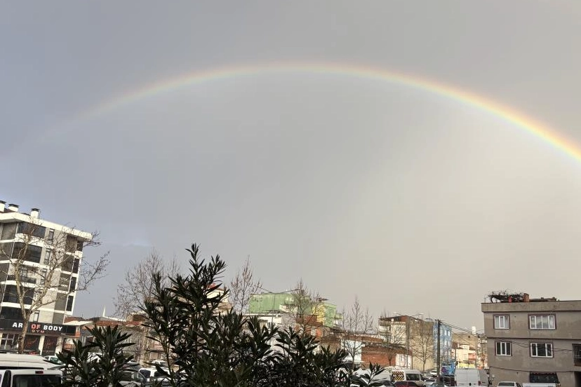 Kentin pek çok noktasından rahatlıkla görülebilen gökkuşağı, özellikle yüksek kesimlerde daha net şekilde izlendi.