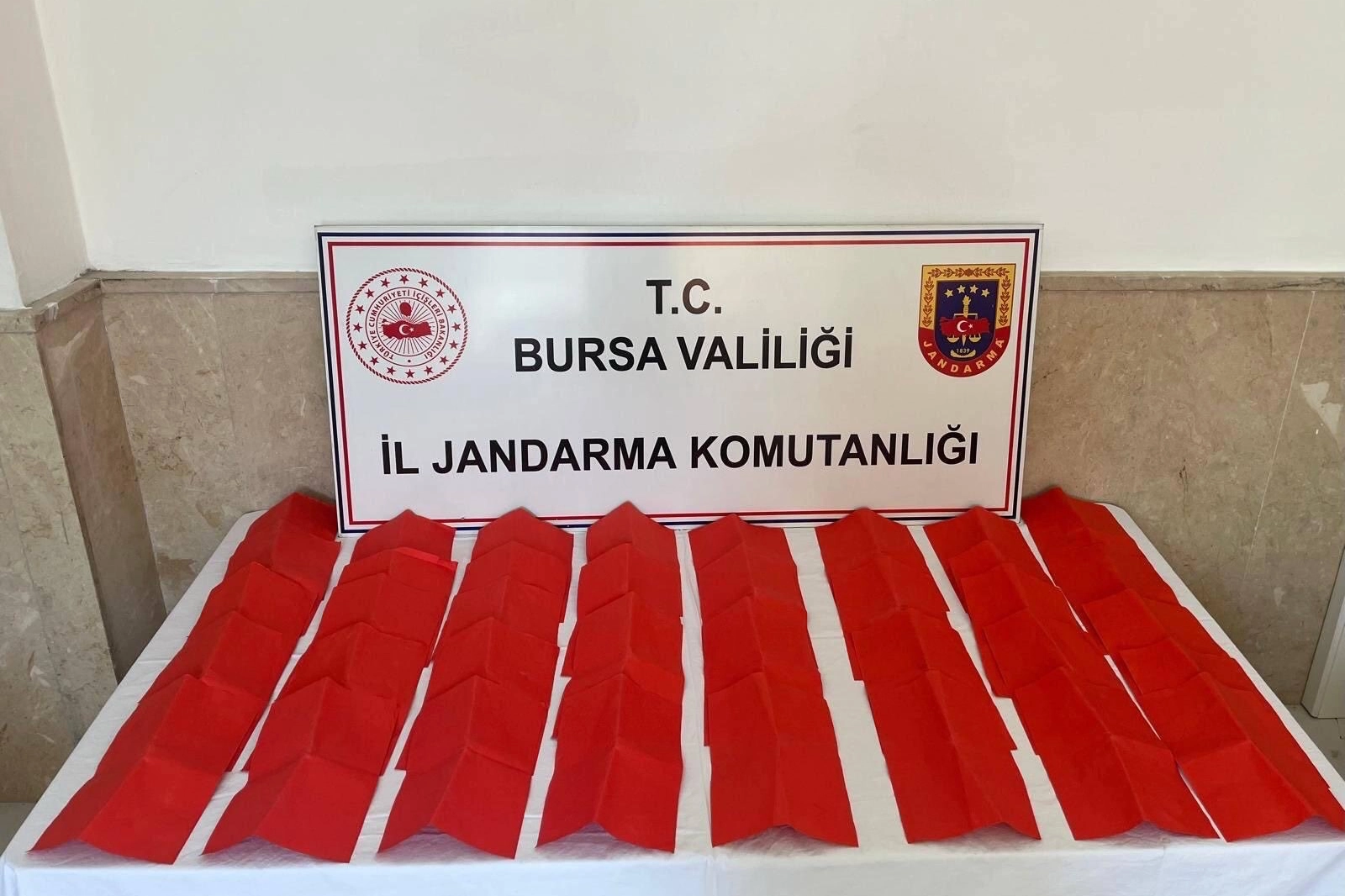 Bursa Cumhuriyet Başsavcılığı koordinesinde, İl Jandarma Komutanlığı’na bağlı Narkotik Şube Müdürlüğü ekipleri tarafından gerçekleştirilen operasyonda durdurulan şüpheli şahsın üst aramasında, paket içerisinde A4 kağıdına emdirilmiş halde 37 parça sentetik kannabinoid bulundu. Ele geçirilen maddenin toplamda yaklaşık 46 bin içimlik olduğu belirlendi.