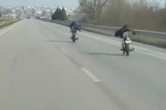 Karacabey-Bandırma karayolunda seyir halinde olan bir vatandaş tarafından cep telefonu ile kaydedilen görüntülerde, iki motosiklet sürücüsünün motosiklet üzerine yüzüstü uzanarak ilerlediği görüldü. Görüntüyü kaydeden aracın hız göstergesinde ise hızın yaklaşık 115 kilometre olduğu dikkat çekti.