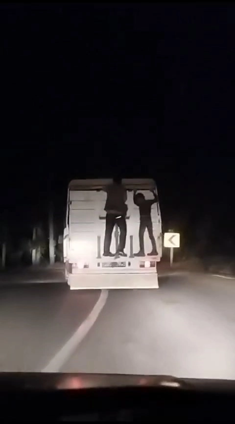 Birinin çocuk olduğunu fark eden arkadaki sürücü, kornaya basarak kamyonet sürücüsünü uyarmaya çalıştı. Ancak oralı olmayan kamyonet sürücüsü de arkasında asılı olduğunu fark etmediği 2 kişiyle karanlıkta kayboldu.