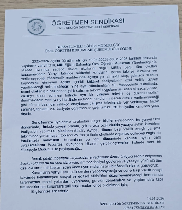 BursaTanık Milyonlarca öğrenci bugün karne heyecanı yaşarken, okullarda yarı yıl tatiline girdi. Ancak kanuna aykırı şekilde Bursa’daki özel okullarda kurs/ders faaliyetlerinin planlanması nedeniyle Özel Sektör Öğretmenleri Sendikası Bursa Temsilciliği, kendilerine bu yönlü planlamaların yapıldığına dair gelen çok sayıda şikayet üzerine Bursa İl Milli eğitim Müdürlüğü’ne dilekçe verdi. "Kurumlar yasa dışı ders koyuyor" Konuya dair Bursa Tanık’a konuşan Özel Sektör Öğretmenleri Sendikası Bursa Temsilcisi Azime Alpaslan, “Yarıyıl tatili kamuda ve özelde aynı yönetmelikle düzenleniyor ve ders yapılması Valilik özel izni hariç kanuna aykırı, yasa dışı. Kurumlar ise bu konuda öğretmenleri ve hatta öğrencileri hiçe sayarak kanun dışı ders koyuyor.” dedi. Özel okullarda çalışan öğretmenlere dinlenme ve tatil hakkının tanınmadığını belirten Alpaslan, açık bir yasa ihlali olduğu gerekçesiyle Milli eğitim Bakanlığı’nın bu konuda gerekli uyarıları ve denetimleri yapmasını beklediklerini ifade etti. "Önlem alınmazsa eylemlerde bulunacağız" Bursa İl Milli Eğitim Müdürlüğü Özel Öğretim Şube Müdür Yardımcısı Mustafa Kahya ile yaptıkları görüşmede kendilerine gerekli uyarıların ve denetimlerin yapılacağının iletildiğini kaydeden Alpaslan, “Ancak hala Bursa'da pek çok okuldan yarıyıl tatili ders planlamalarının yapıldığını ve öğretmenlerin okullara derse çağrıldığını öğreniyoruz. Bursa'nın bilinen, ünlü, büyük ve de orta küçük onlarca okulunda öğretmenler yasaya aykırı şekilde derse sokulacak. Kurumları mail yoluyla uyardık, İl Milli Eğitim Müdürlüğü’ne dilekçe verdik. Bir önlem alınmazsa Pazartesi günü ders yapıldığını kanıtlarıyla birlikte hem medyayla paylaşıp hem de kanuni başvurularla yarıyıl tatil hukukuna uygun bir dönem geçirilmesi için eylemlerde bulunacağız.” dedi.