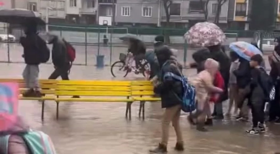 Olay Mahmudiye Mahallesi'nde eğitim öğretime devam eden Müşerref Muzaffer Samda İlkokulu bahçesinde meydana geldi. Yoğun yağış nedeniyle okulun bahçesi göle döndü. Veliler öğrencileri okuldan çıkarmak için bankları sıralayıp geçirdiler.