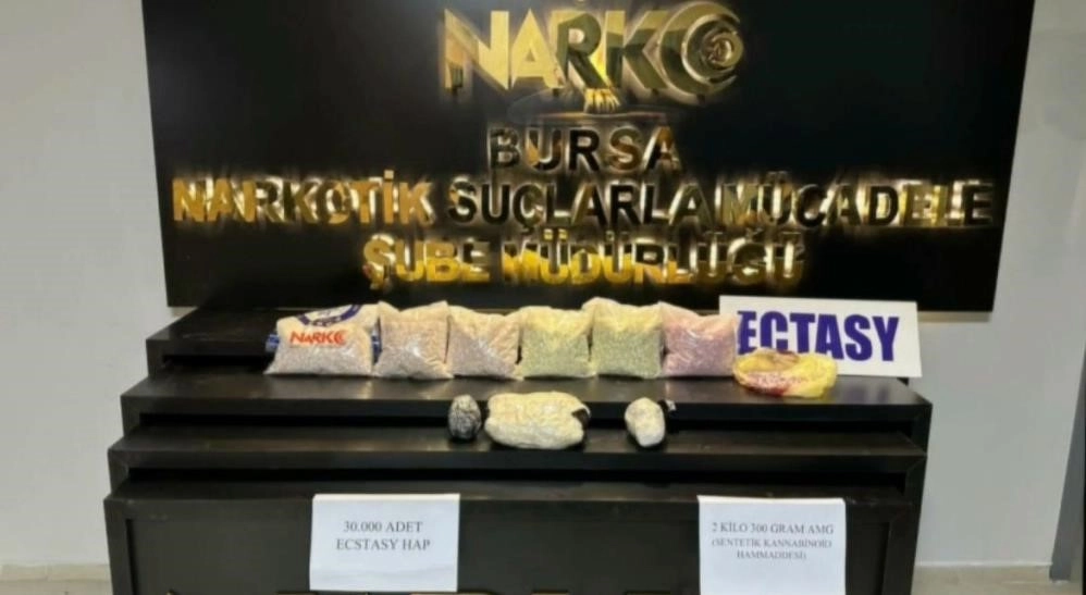 Bursa İl Emniyet Müdürlüğü Narkotik Suçlarla Mücadele Şube Müdürlüğü’nün, Cumhuriyet Başsavcılığı koordinesinde yürütülen soruşturma kapsamında, özel harekât, çevik kuvvet, dedektör köpekler, İHA’lar ve 100 ekiple toplam 600 personel katıldı. Şafak vakti yürütülen operasyonda kapılar koçbaşlarıyla kırıldı. Ekiplerin eş zamanlı baskın yaptığı adreslerde ve arama yapılan tırlarda, 2 kilo 700 gram kokain, bin 500 kök Hint keneviri bitkisi, 30 bin adet ecstasy hap, 2 kilo 300 gram sentetik kannabinoid ham maddesi, 250 gram esrar, 160 adet sentetik ecza, 35 gram sentetik kannabinoid madde 41 şüpheliyle birlikte yakalandı. Ayrıca operasyonda 3 ruhsatsız tabanca, 7 adet fişek, 2 hassas terazi ve uyuşturucu ticaretinden elde edildiği değerlendirilen 180 bin TL nakit para da ele geçirildi. 34 KİŞİ TUTUKLANDI İfadesi alınmak üzere emniyete götürülen şüpheliler buradaki işlemlerinin ardından adliyeye sevk edildi. Hakim karşısına çıkan 41 şüpheliden 34’ü tutuklanırken, 7 şüpheliden 4’ü adliye kontrol şartıyla serbest kaldı.