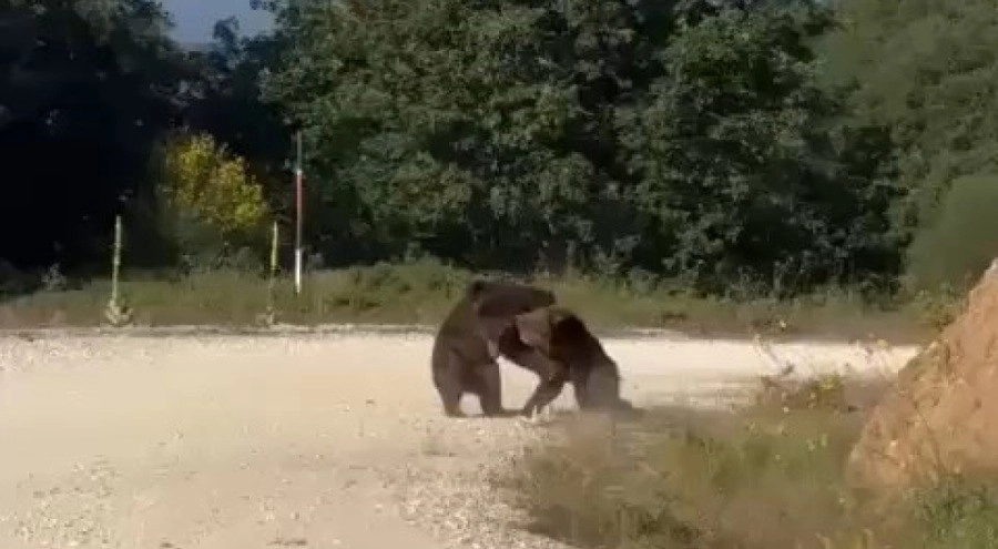 Bursa'da vatandaşlar tarafından kayda alınan görüntüler, izleyenlerin içini ürpertti. Bursa'nın Gemlik ilçesi Haydariye Mahallesinde yola inen 2 ayı, yolun ortasında güreşe tutuştu.