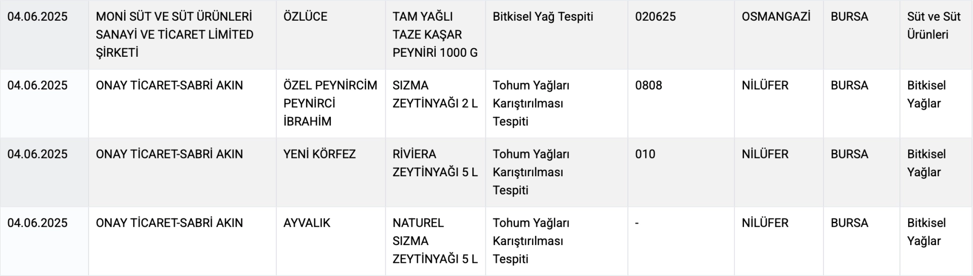 Osmangazi’de faaliyet gösteren MONİ Süt ve Süt Ürünleri Sanayi ve Ticaret Limited Şirketi, “Tam Yağlı Taze Kaşar Peyniri (1000 g)” ürününde bitkisel yağ tespiti yapılması nedeniyle teşhir edildi. Tüketicilerin özellikle süt ve süt ürünleri konusunda dikkatli olması gerektiği vurgulandı.