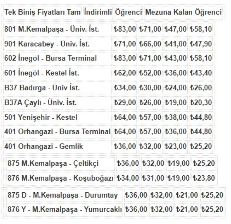 Bursa Büyükşehir Belediyesi'nin ulaşım iştiraki olan BURULAŞ, bazı otobüs hatlarında fiyat artışına gittiğini duyurdu. Resmi açıklamaya göre, şehiriçi otobüsler, tramvaylar ve metroların bilet fiyatlarında bir değişiklik olmazken, kent merkezi ile ilçeler arasında hizmet veren birçok hat için fiyatlar yükseltildi. Duyuruya göre, yeni fiyatlar bugünden itibaren geçerli olacak.