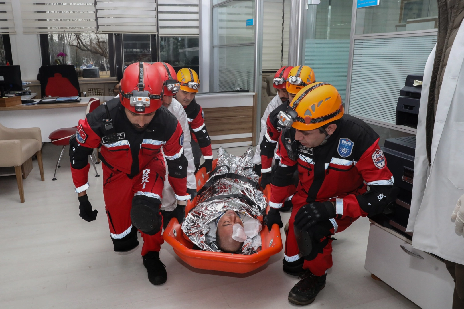 BUSKİ Genel Müdürlüğü Binası’nda gerçekleştirilen tatbikat ile deprem ve yangın senaryolarında aşamalı olarak yapılması gerekenler aktarıldı. Senaryo gereği bina hızlı ve güvenli bir şekilde boşaltılırken BUSKİ Arama Kurtarma Ekibi de uzman kadrosuyla olay yerinde görev aldı. Yangın durumundaki olası gaz sızıntıları ekipler tarafından titizlikle kontrol edildi. Çalışanların yaralandığı senaryolardaki tahliye işlemleri de gerçeğe uygun şekilde canlandırıldı.