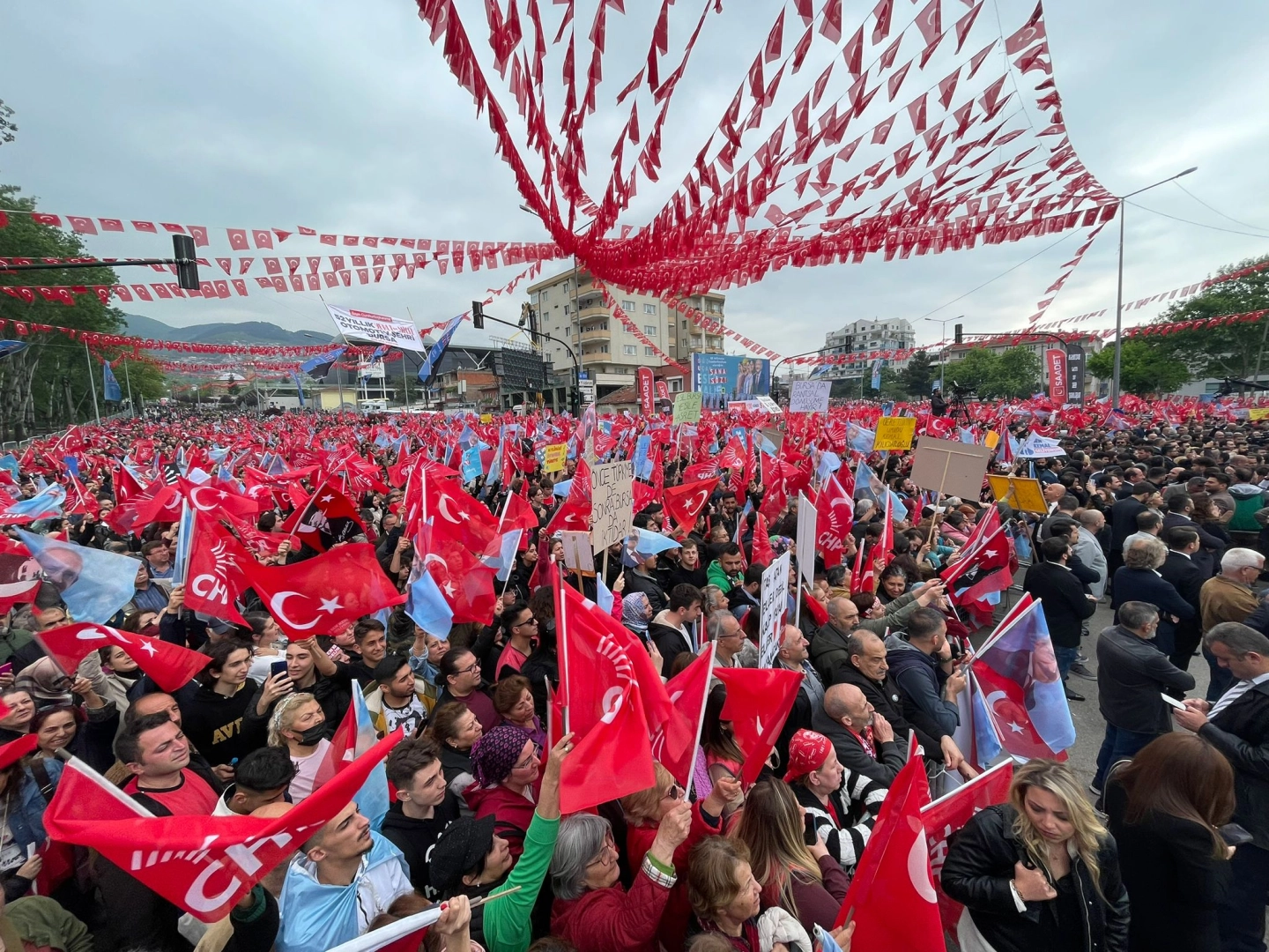 Cumhuriyet Halk Partisi (CHP) Genel Başkanı 13. Cumhurbaşkanı Adayı Kemal Kılıçdaroğlu seçime 3 gün kala Bursalılarla buluştu. Gökdere Meydanı’nda düzenlenen miting için polis ekiplerinin yoğun güvenlik önlemleri aldı. Saat 17.00’da başlayacak olan miting için Bursalılar ellerinde Türk bayrakları ve pankartlarla erken saatlerde alana gelmeye başladı. Alanda bulunan yurttaşlar ‘Korkmuyoruz, korkmayacağız kimsenin yanına bırakmayacağız’ ‘Kimse şah değil padişah değil’ ‘Ülkeni sev, cumhuriyeti koru, sandığa git, trafoya girme,'‘Güneşin olduğu yerde ampule ihtiyaç yok’, ‘Eli taş tutanlar değil kalp yapanlar kazanacak’, ‘Kemaller ölmez şekil değiştirir’ yazılı pankartlar açtılar.