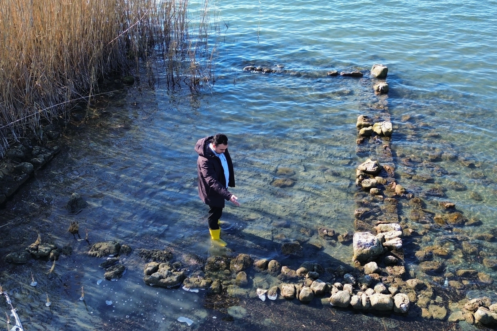 Göl sularının çekilmesiyle tamamen görünür hâle gelen kalıntıların, İznik sahil bandında kumsalın hemen yanında yer aldığı görülürken, yapıyı fark eden ekip heyecan yaşadı.