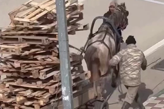 Aşırı yük nedeniyle yükün ağırlığı altında güçlükle ilerleyen atın dengesini sağlamakta zorlandığı anlar, çevrede bulunan bir vatandaş tarafından cep telefonu kamerasıyla kaydedildi.