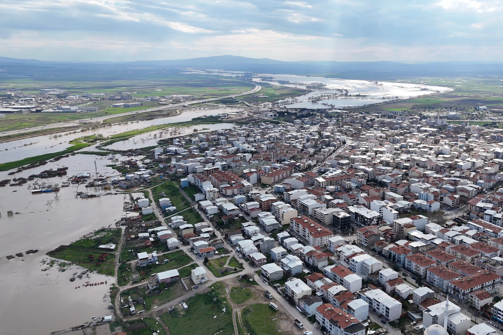 Bursa'da 3 gün aralıksız yağan yağmur, hayatı olumsuz etkiledi. Karacabey ilçesi Bayıraltı Mahallesinde tarım arazileri adeta göle döndü. Dron ile havadan görüntülenen manzarada, geniş ekili alanların tamamen suyla kaplandığı, bazı bölgelerde ise su seviyesinin yol kenarlarına kadar ulaştığı görüldü.