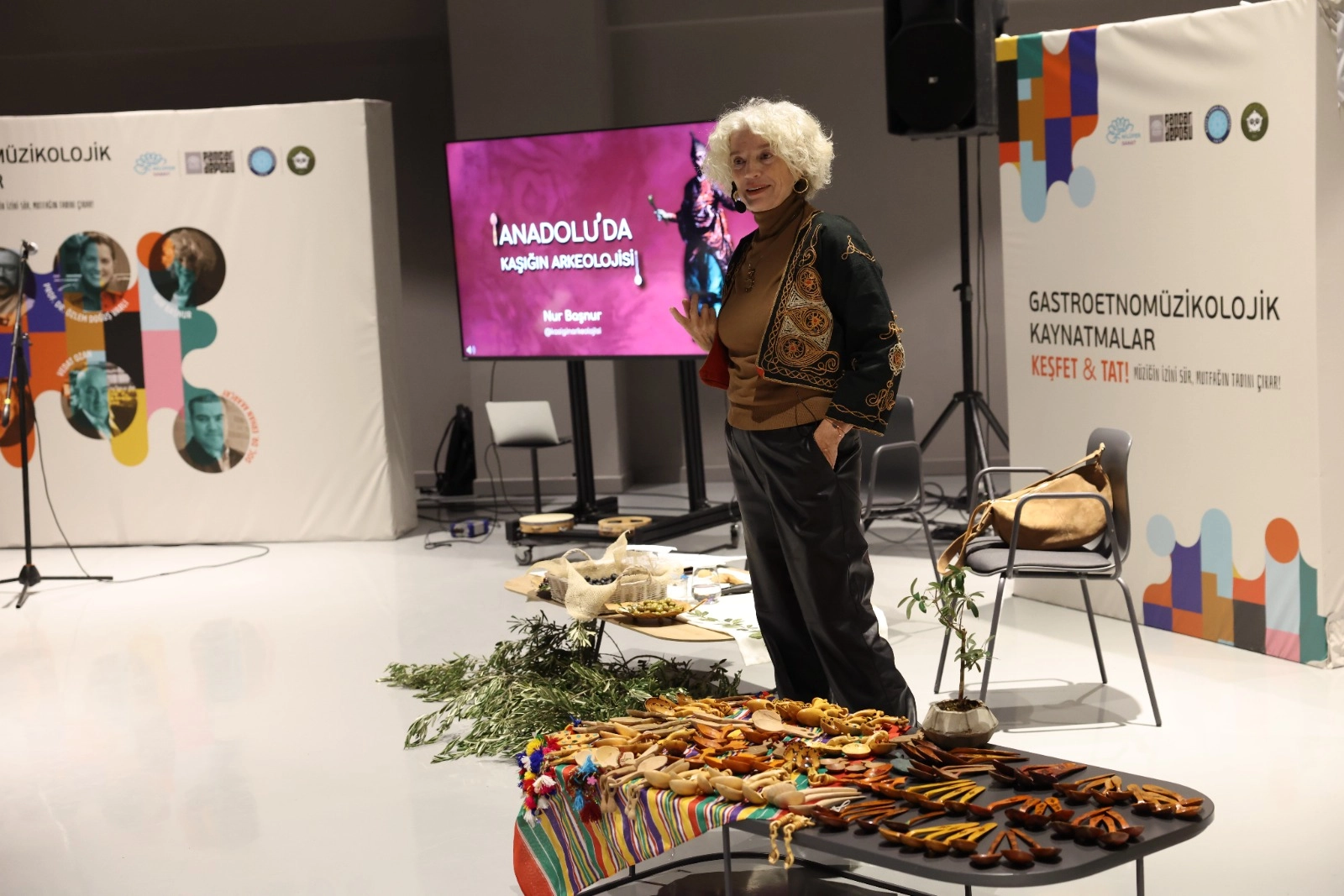 Programda “Anadolu’da Kaşığın Arkeolojisi” başlıklı bir sunum gerçekleştiren Nur Başnur, kaşığın sadece bir mutfak gereci olmadığını, aynı zamanda derin bir kültürel birikimi temsil ettiğini vurguladı. Başnur, kaşığın Türk ve dünya tarihindeki kullanım alanlarını, gelişim sürecini, dini ve kültürel sembollerini katılımcılarla paylaştı. Kaşığın sofradaki yerinden halk kültüründeki yansımalarına kadar pek çok detay, izleyiciler tarafından ilgiyle dinlendi. Sohbetin müzikle renklendiği gecede, anlatılan hikayelere özel lezzetler eşlik etti. Katılımcılar; Gemlik, Tirilye, Manisa ve Artvin gibi Türkiye’nin önemli zeytin merkezlerinden gelen yerel lezzetlerin yanı sıra, Yunanistan zeytinlerini de tatma fırsatı buldu.
