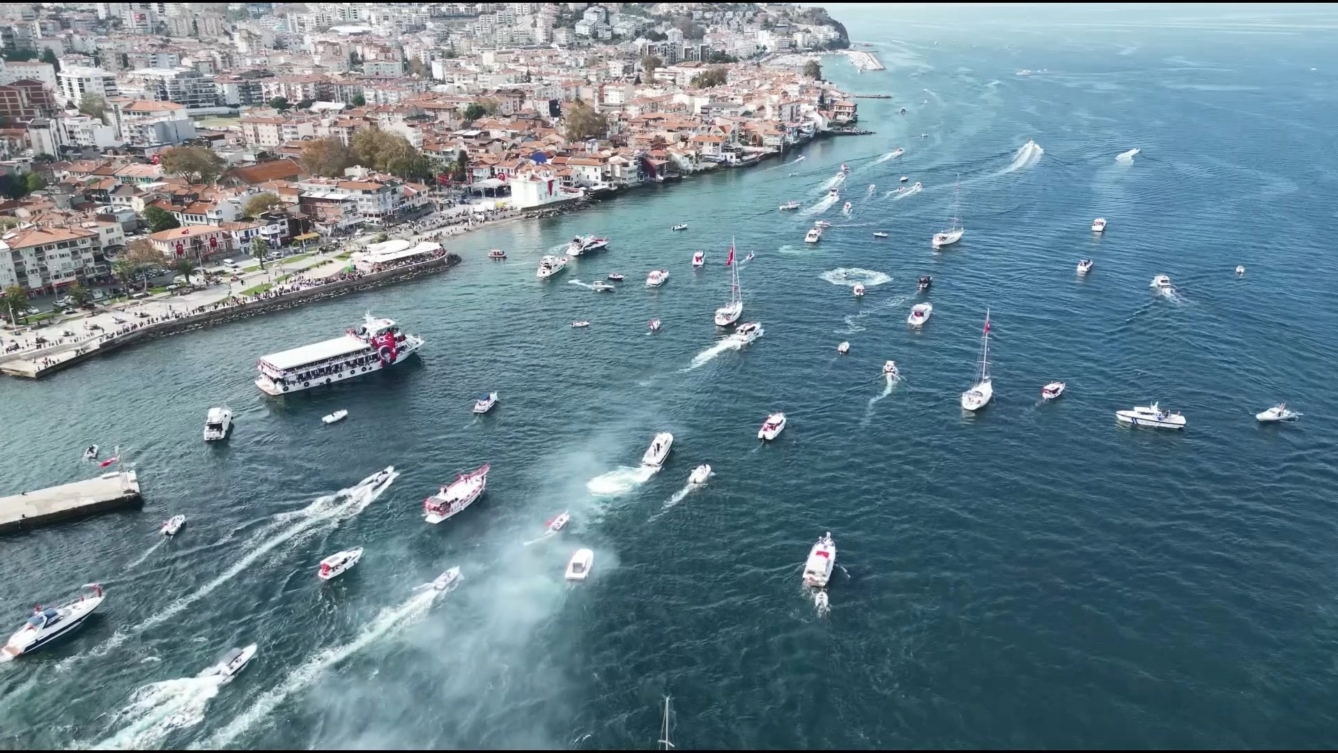Cumhuriyet’in ilanının 100. yıl dönümü, tüm yurtta olduğu gibi Bursa'da da büyük coşkuyla kutlandı. Mudanya ilçesinde ise denizde onlarca vatandaş, tekneleriyle coşkuya ortak oldu. O anlar havadan görüntülendi. 29 Ekim Cumhuriyet Bayramı’nın 100. yılı tüm yurtta coşkuyla kutlanırken, Bursa’nın Mudanya ilçesinde onlarca vatandaş kendilerine ait teknelerde coşkuyu denize taşıdı. Denize taşan kortej renkli görüntülere sahne oldu. Coşkuya dahil olan teknedeki vatandaşlar mütareke binasının önünde saygı duruşunda bulunduktan sonra İstiklal Marşı’nı okudu. Ünsal Kaptan da yüzlerce vatandaşı bayraklarla gezi teknesine doldurarak kutlamalara katıldı.