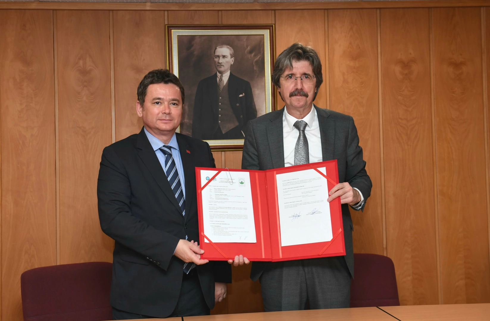 Bursa Uludağ Üniversitesi Rektörlük Binası’nda imzalanan protokolün ardından Osmangazi Belediye Başkanı Erkan Aydın ve Bursa Uludağ Üniversitesi Rektörü Prof. Dr. Ferudun Yılmaz, günün anısına birbirine hediye takdim etti.