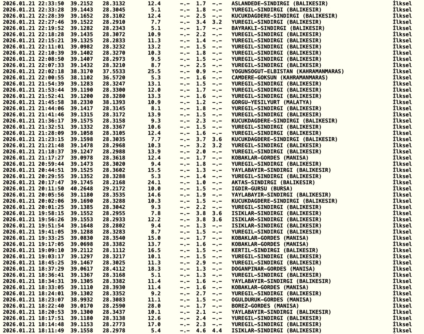 Geçtiğimiz yıl çok geç depremin meydana geldiği Balıkesir'in Sındırgı ilçesinde bugün yine deprem hareketliliği yaşanıyor. Gün içerisinde belirli aralıklarla ve küçük ölçekle meydana gelen depremlerin ardından 18:11’de meydana gelen 4.5 büyüklüğündeki deprem Bursa başta olmak üzere çevre illerde de paniğe neden oldu. Saat 23.11’de meydana 4.1 büyüklüğündeki deprem de yine vatandaşlar tarafından hissedilirken, beraberinde korku da yarattı. Son olarak yine Sındırgı'da saat 23.28'de 4.4 büyüklüğünde korkutan bir deprem daha meydana geldi. Gün içerisinde ilk şiddetli deprem olan 4.5 büyüklüğündeki depremin ardından saat 23.35 itibariyle merkez üssü Sındırgı olan 50'ye yakın deprem meydana geldi. Depremlerin büyüklükleri 1.3 ile 4.5 arasında değişirken, orta ölçekli meydana gelen depremler Bursa'da da hissedildi.