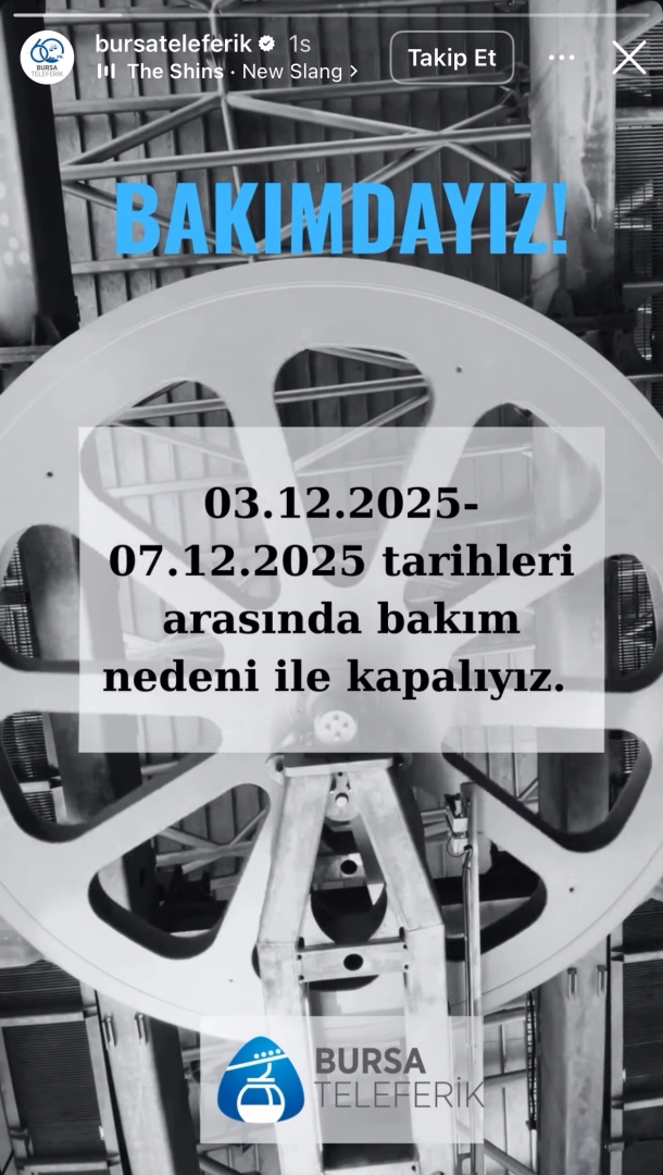 İşletme tarafından sosyal medya üzerinden yapılan duyuruda, teleferiğin 3 Aralık 2025 – 7 Aralık 2025 tarihleri arasında bakım sebebiyle hizmet vermeyeceği bildirildi.