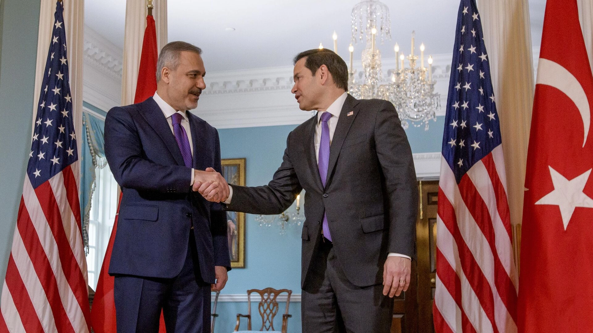 Dışişleri Bakanı Hakan Fidan, dün ABD'nin başkenti Washington'a ziyareti sırasında ABD Dışişleri Bakanı Marco Rubio ile heyetelerarası bir görüşme gerçekleştirdi. ABD Dışişleri Bakanlığı Sözcüsü Tammy Bruce, Fidan ile Rubio görüşmesine ilişkin açıklama yaptı. Açıklamada, iki bakanın güvenlik ve ticaret alanındaki kilit konularda iş birliğini görüştüğü dile getirilirken; Bakan Rubio’nun Ukrayna ve Güney Kafkasya'da barış için Türkiye'nin desteğini talep ettiği belirtildi. Açıklamada şu ifadeler de kaydedildi: "Türkiye'nin IŞİD'i yenmek için Küresel Koalisyon'daki liderliğini takdir eden Bakan, ne uluslararası terörizm için bir üs ne de İran'ın istikrarsızlaştırıcı faaliyetleri için bir yol olan istikrarlı, birleşik ve barışçıl bir Suriye'nin desteklenmesi için yakın iş birliğine duyulan ihtiyacı yineledi. Bakan ayrıca ikili ticarette son dönemde kaydedilen ilerlemelere dikkat çekti ve ileriye dönük olarak daha da büyük bir ekonomik ortaklığı teşvik etti. Son olarak Bakan, Türkiye'de son dönemde yaşanan tutuklamalar ve protestolarla ilgili endişelerini dile getirdi." Görüşmeden sonra Rubio, resmi sosyal medya hesabından yaptığı paylaşımda, "Bugün, her iki ülkemize de fayda sağlayacak ticaret ve güvenlik konusunda iş birliğini görüşmek üzere Türk Dışişleri Bakanı Hakan Fidan ile bir araya geldik" dedi. Rubio, paylaşımda şu ifadelere de yer verdi: "ABD, Türkiye ile son dönemde yapılan ticaret ilerlemelerini sürdürüyor. Ayrıca, Ukrayna ve Güney Kafkasya'daki barıştan, İran'ın istikrarsızlaştırıcı faaliyetlerine karşı Suriye'yi desteklemeye kadar temel konularda birlikte ortaklık kuruyoruz. Türkiye'deki son tutuklamalar ve protestolarla ilgili endişelerimi dile getirdim."