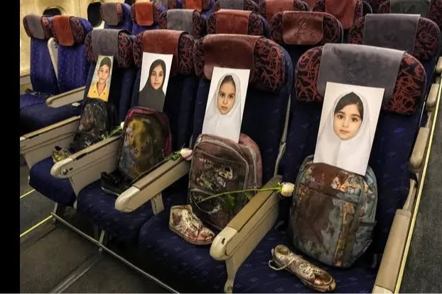 İran heyetini Pakistan'a götüren uçağa ABD'nin Minab kentindeki bir ilkokula düzenlediği saldırıda hayatını kaybeden çocukların fotoğrafları, ayakkabıları, çantaları ve beyaz gül konuldu.