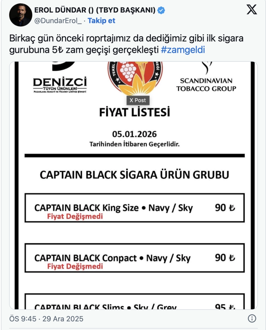 Türkiye Tekel Bayileri Yardımlaşma Derneği (TBYD) Başkanı Erol Dündar, sosyal medya hesabından yaptığı açıklamada Captain Sigara Grubu'na bağlı ürünlerde fiyat artışına gidildiğini duyurdu. Dündar, daha önce yaptığı değerlendirmelerde yılbaşına yakın dönemdesigara fiyatlarında artış yaşanabileceğine dikkat çekmişti. Yapılan zamla birlikte Captain Black grubunda en ucuz sigaranın fiyatı 90 TL'ye, en pahalı sigaranın fiyatı ise 95 TL'ye yükseldi. Zam kararı, tekel bayileri ve sigara kullanıcıları tarafından yakından takip edilirken, önümüzdeki günlerde diğer sigara gruplarında da benzer artışların yaşanabileceği ifade ediliyor.