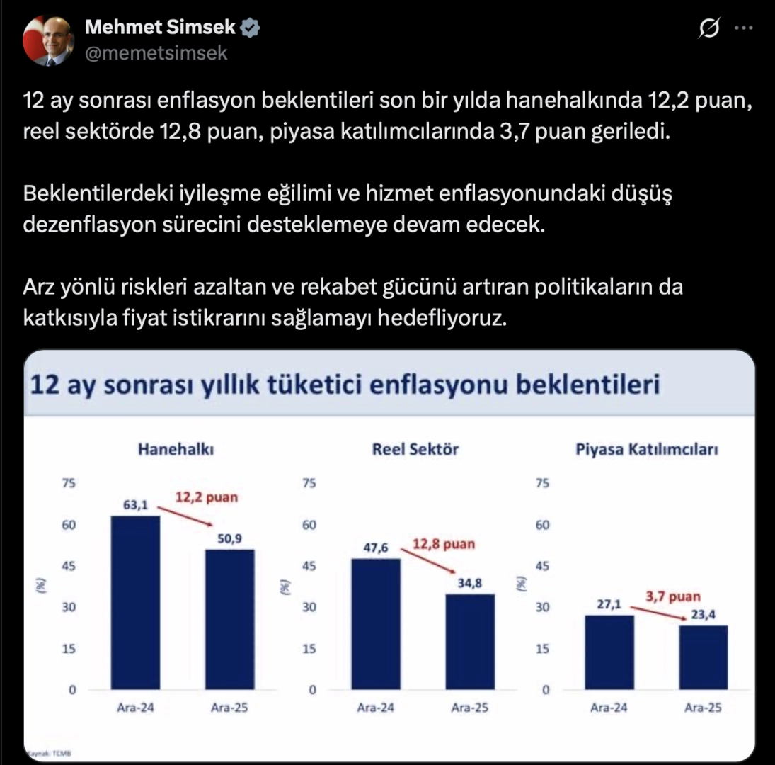 Hazine ve Maliye Bakanı Mehmet Şimşek, enflasyon beklentilerindeki iyileşme eğilimi ile hizmet enflasyonundaki düşüşün dezenflasyon sürecini desteklemeye devam edeceğini bildirdi. Şimşek, X hesabından yaptığı paylaşımda, Türkiye Cumhuriyet Merkez Bankası'nın (TCMB) "Sektörel Enflasyon Beklentileri" verilerini değerlendirdi. 12 ay sonrası enflasyon beklentilerinin son bir yılda hane halkında 12,2, reel sektörde 12,8, piyasa katılımcılarında 3,7 puan gerilediğine dikkati çeken Şimşek, şunları kaydetti: