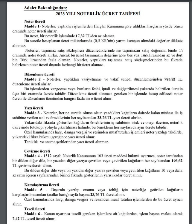 Resmi Gazete’nin bugünkü sayısında yayımlanan 2023 yılı noterlik ücret tarifesine göre, noterler taşınmaz sözleşmelerinde, satışa konu taşınmazın satış değerinin binde 1’i oranında ücret alacaklar. Bu ücret 500 TL’den az, 4 bin TL’den fazla olamayacak. Noterlerin, yaptıkları işlemlerden harçlar kanununa göre aldıkları harçların yüzde 30’u oranında tahsil ettiği noter ücretinde alt sınır 8.66 TL’den 17.32 TL’ye, vasiyetname ve vakıf senedi düzenlemesi ücreti 391.91 TL’den 783.82 TL’ye, hazırlanan her bir sayfadan alınan yazı ücreti 11.88 TL’den 23.76 TL’ye, tescili gereken işlemlere ait kağıtlardan, işlem başına maktu olarak alınan ücret ise 3.71 TL’den 7.42 TL’ye çıkarıldı.
