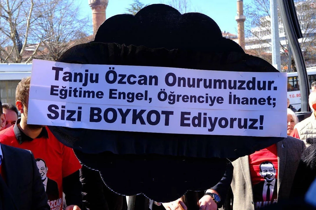 CHP Bolu İl Başkanı Tahsin Mert Karagöz, Bolu Belediye Başkan Vekili Mehmet Tuna Özcan, Merkez İlçe Başkanı Çetin Uç ve CHP’li Belediye Meclis üyelerinden oluşan heyet, Aktaş Mahallesi’nde bulunan bazı zincir marketlerin şubelerine üzerinde "Tanju Özcan Onurumuzdur. Eğitime Engel, Öğrenciye İhanet; Sizi Protesto Ediyoruz" yazılı siyah çelenk bıraktı.
