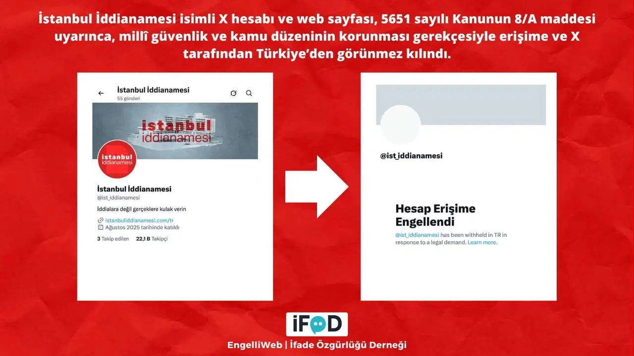 İBB'ye yönelik 'yolsuzluk' soruşturması kapsamında hazırlanan iddianamenin ardından açılan ve iddianameyi inceleyen 'İstanbul İddianamesi' isimli X hesabı ve internet sitesine erişim engeli getirildi. 'İstanbul İddianamesi' X hesabı (ist_iddianamesi) ve web sitesi, 5651 sayılı Kanunun 8/A maddesi uyarınca, millî güvenlik ve kamu düzeninin korunması gerekçesiyle erişime engellendi. İfade Özgürlüğü Derneği Engelli Web'in aktardığına göre hesap, X tarafından Türkiye'den görünmez kılındı.