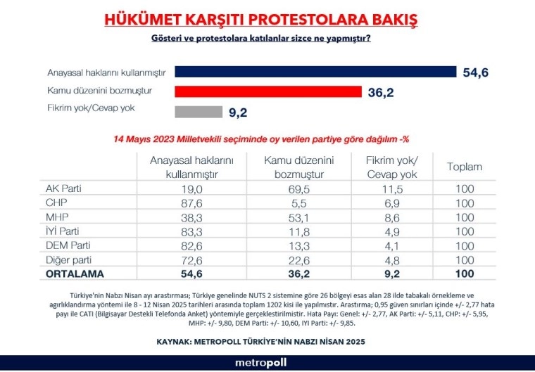 Metropoll Araştırma'nın kurucusu ve yöneticisi Özer Sencar, sosyal medya hesabından paylaştığı ankette yurttaşların hükümet karşıtı protestolara bakışı ölçüldü. 'Gösteri ve protestolara katılanlar sizce ne yapmıştır?' sorusunun yöneltildiği ankette, yüzde 54.6 'anayasal haklarını kullanmıştır', yüzde 36.2 'kamu düzenini bozmuştur' ve yüzde 9.2 de 'fikrim yok' cevabını verdi. AKP seçmeninin yüzde 19'u 'anayasal haklarını kullanmıştır' derken, yüzde 69.5 'kamu düzenini bozmuştur' yanıtını verdi. CHP seçmeninin ise yüzde 87.6'sı 'anayasal haklarını kullanmıştır' cevabını verirken, yüzde 5.5'i ise 'kamu düzenini bozmuştur' cevabından yana tercihini kullandı. MHP'lilerin ise yüzde 38.3'ü 'anayasal haklarını kullanmıştır', yüzde 53.1 de 'kamu düzenini bozmuştur' dedi.