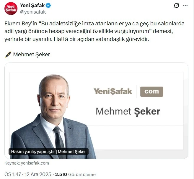 YENİ ŞAFAK SOSYAL MEDYA HESABINDAN PAYLAŞTI Söz konusu yazı, Yeni Şafak’ın sosyal medya hesabından da paylaşıldı. Paylaşımda yazıdan şu ifadeler öne çıkarıldı: "Ekrem Bey'in 'bu adaletsizliğe imza atanların er ya da geç bu salonlarda adil yargı önünde hesap vereceğini vurguluyorum' demesi, yerinde bir uyarıdır. Hatta bir açıdan vatandaşlık görevidir."