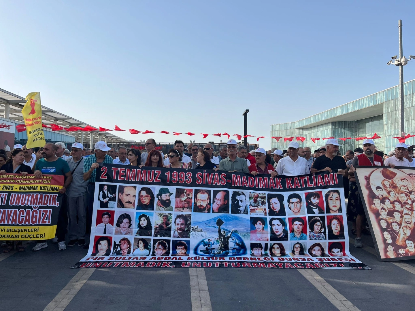 2 Temmuz 1993'te Madımak Oteli'nde hayatını kaybeden 33 aydın ve sanatçı, Madımak Katliamı’nın 31’inci yıl dönümünde Bursa Alevi Bileşenleri ve Bursa Demokrasi Güçlerinin çağrısıyla Bursa’da Kent Meydanı’nda anıldı. Alevi Bektaşi Federasyonu ve Bileşenleri adına basın açıklamasını Panayır Cemevi Başkanı Yusuf Kaplan okudu.