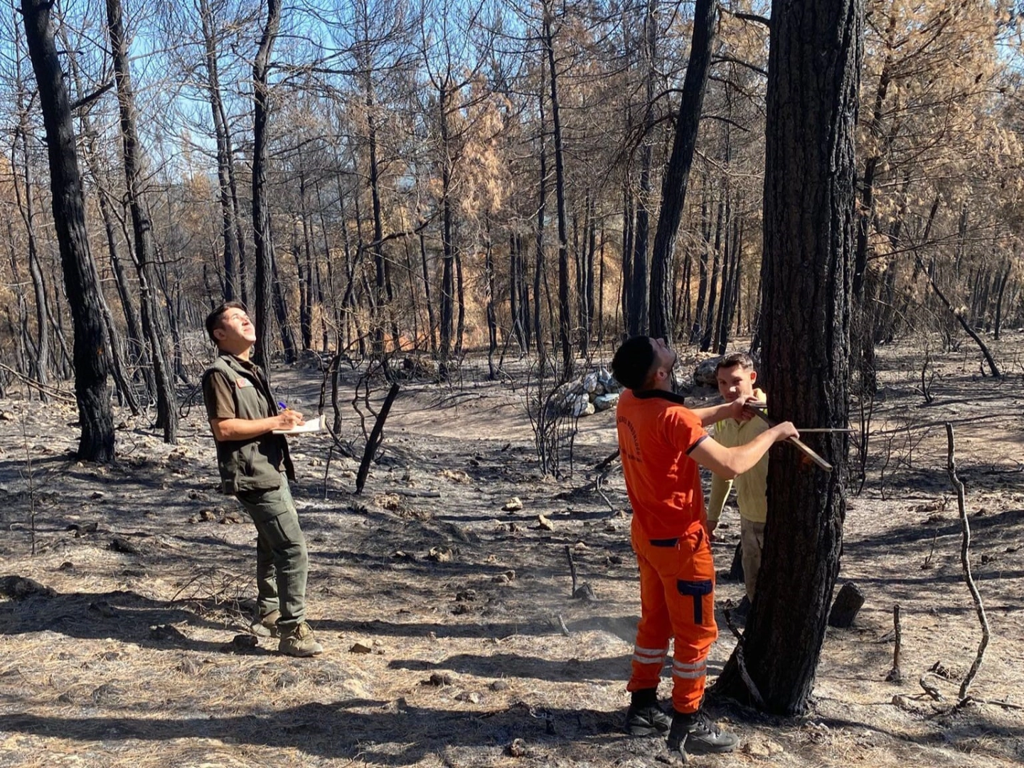 Yangının izlerini bir an önce silmek için temizlik çalışmalarının başladığını belirten yetkililer, yeniden ormanlaştırma çalışmalarının 2026 yılı sonuna kadar tamamlanması hedeflendiğini söyledi. Ekipler ellerinde metrelerle ağaçları karadan, dron ile de havadan tespit ettiler.