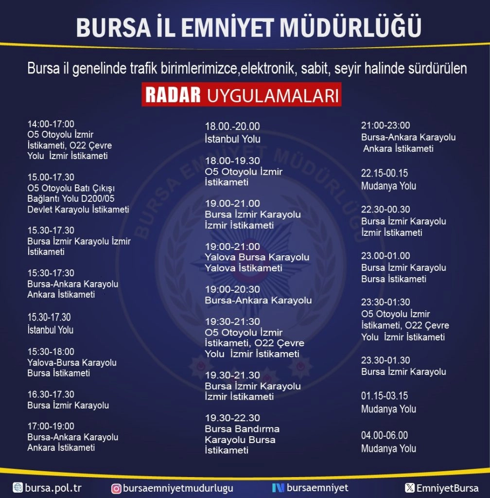 Bursa Emniyet Müdürlüğü, il genelinde gerçekleştirilecek olan elektronik, sabit ve seyir halindeki radar uygulamaları kapsamında, hız ihlallerine ilişkin yapılması planlanan denetimlere dair bilgi paylaştı.