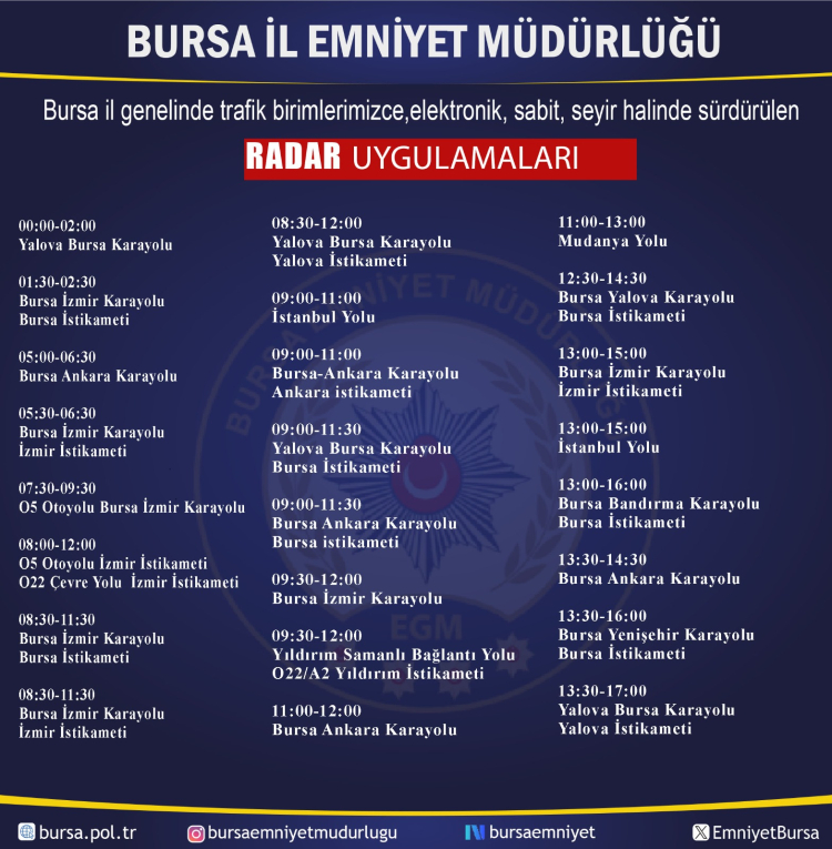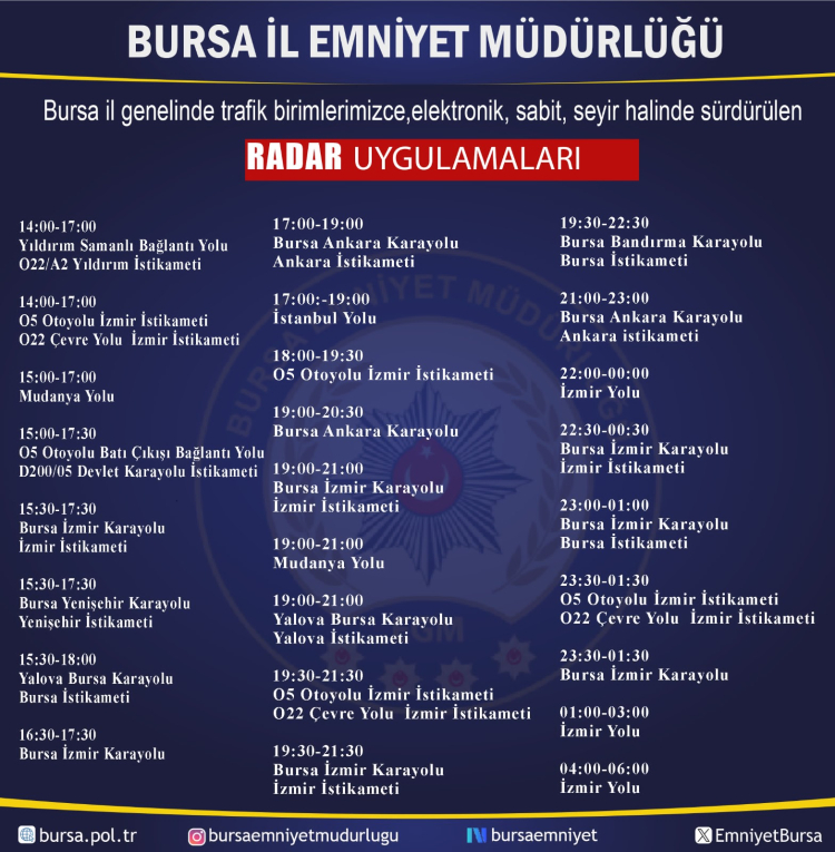 Bursa Emniyet Müdürlüğü, il genelinde gerçekleştirilecek olan elektronik, sabit ve seyir halindeki radar uygulamaları kapsamında, hız ihlallerine ilişkin yapılması planlanan denetimlere dair bilgi paylaştı.