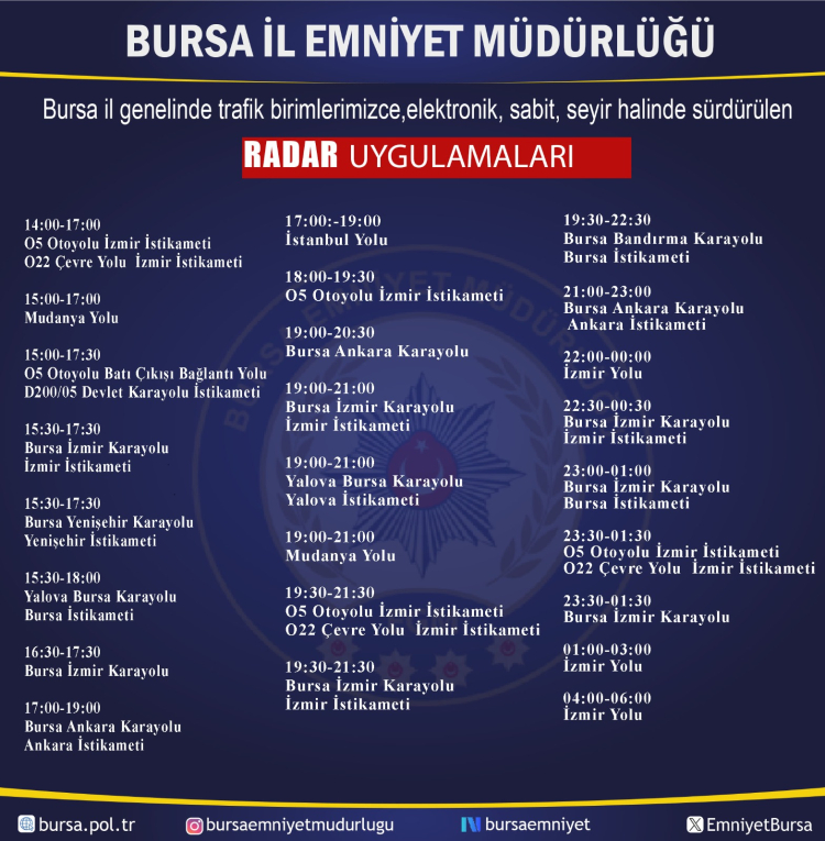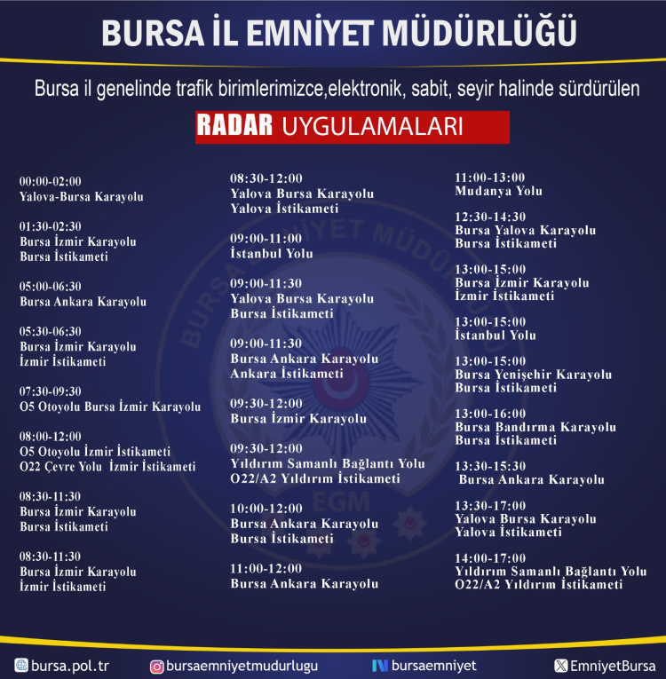 Bursa Emniyet Müdürlüğü, 14 Şubat Cumartesi günü radar noktalarının nereye kurulacağını paylaştı.
