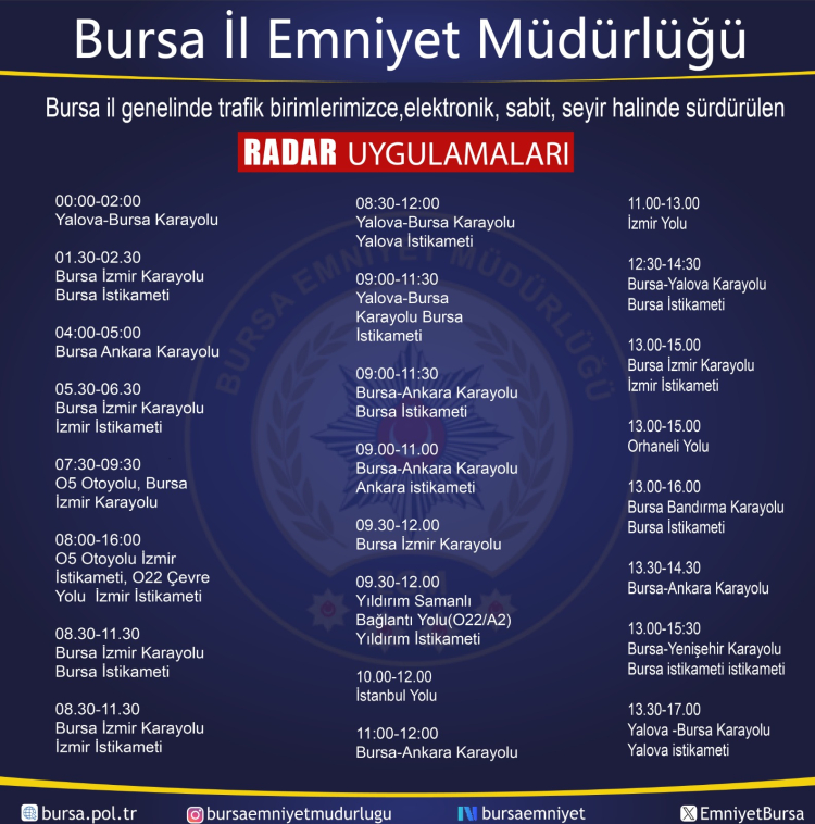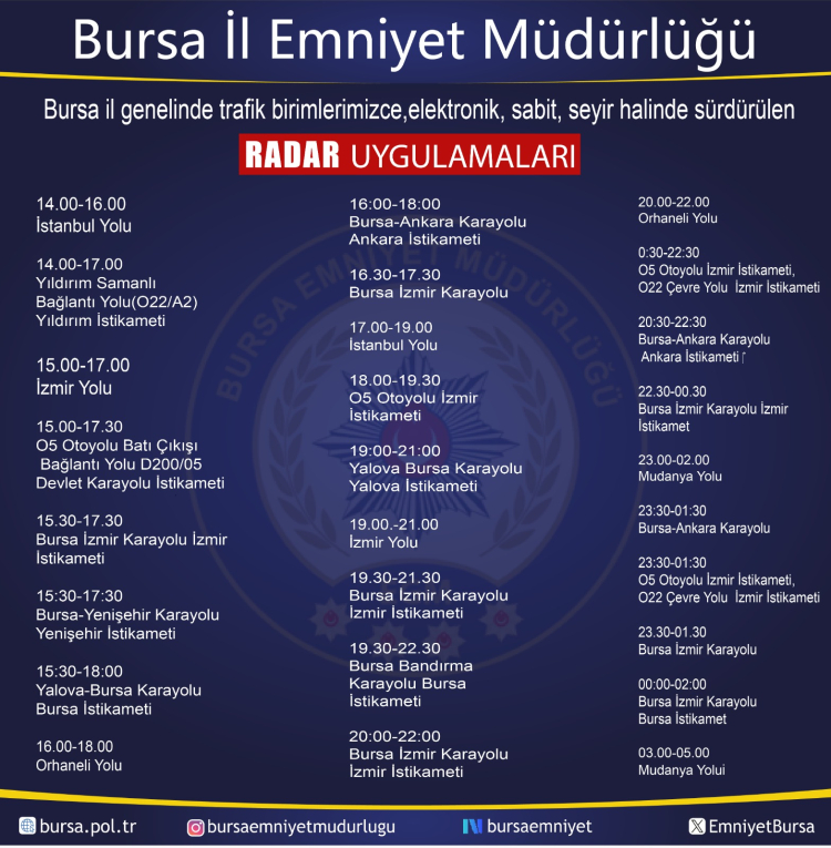 Bursa Emniyet Müdürlüğü, 23 Şubat Pazartesi günü radar noktalarının nereye kurulacağını paylaştı.