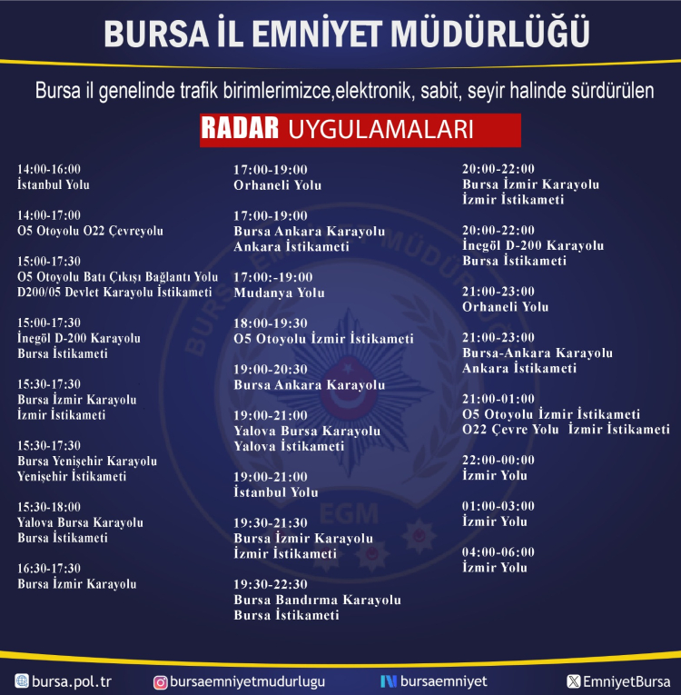 Bursa Emniyet, 28 Şubat Cumartesi günü kent genelinde hız ihlallerini önlemek için radar uygulaması yapılacak noktaları duyurdu.