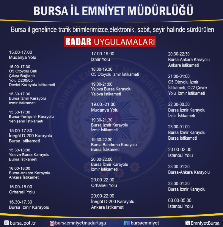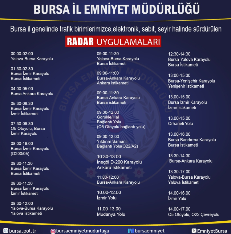 Bursa Emniyet, 7 Mart Cumartesi günü kent genelinde hız ihlallerini önlemek için radar uygulaması yapılacak noktaları duyurdu.