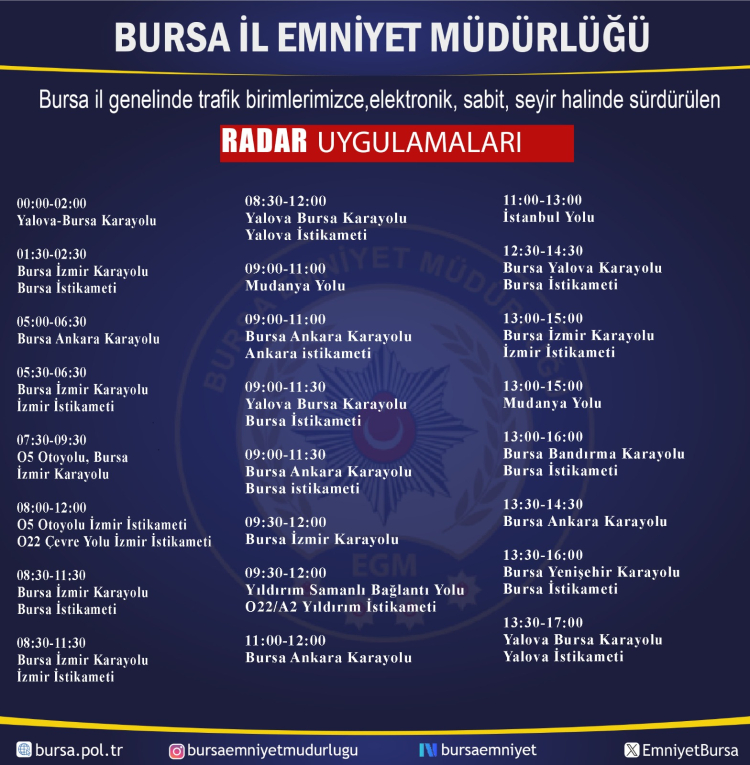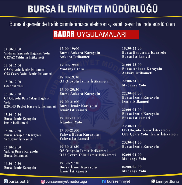 Bursa Emniyet Müdürlüğü, 8 Şubat Pazar günü radar noktalarının nereye kurulacağını paylaştı.