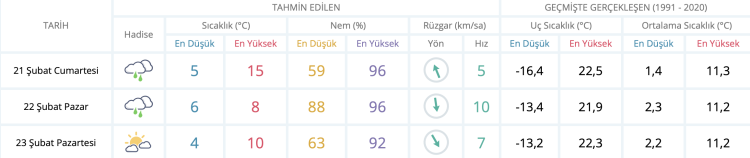 23 Şubat Pazartesi günü ise en düşük sıcaklık 4, en yüksek sıcaklık 10 derece olarak tahmin ediliyor. Nem oranının yüzde 63 ile yüzde 92 arasında değişmesi bekleniyor.