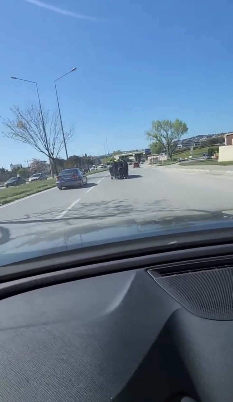 Hem kendi canlarını hem de trafikteki diğer sürücüleri riske atan gençlerin o anları, çevrede bulunan bir vatandaşın cep telefonu kamerasına yansıdı.