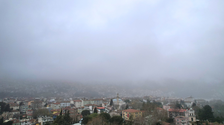 Bursa'nın Osmangazi ilçesi ve çevre ilçelerde sabah saatlerinden itibaren etkili olan sis, kentin yüksek kesimlerinden şehir merkezine doğru ilerliyor.