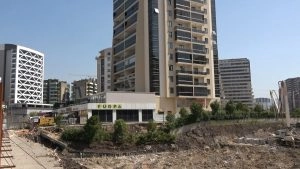 İnşaat işçilerinin çalışma yaptığı esnada sitenin içindeki 16 katlı bir binanın giriş kısmındaki bahçe duvarı kazı nedeniyle bir anda aşağı düştü.