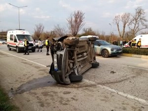 Bursa'nın İnegöl ilçesi Ahmet Türkel çevreyolu üzerinde meydana gelen kazada, 46 yaşındaki sürücü kontrolü kaybedince araç önce refüje çarptı, ardından karşı yöne geçerek takla atıp devrildi.
