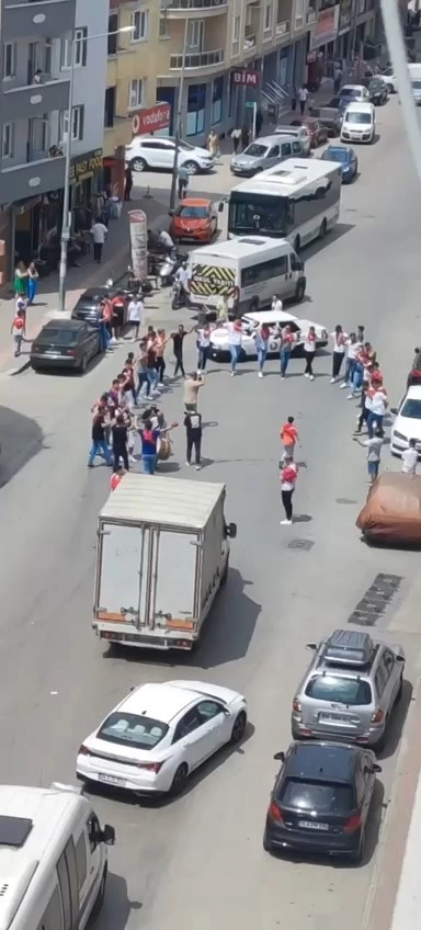 Bursa'nın Osmangazi ilçesi Demirtaş Cumhuriyet Mahallesi'nde arkadaşlarının asker eğlencesi için toplanan bir grup genç, cadde üzerine geçip halay çektiler. Hem çevredekileri hem trafikteki sürücülere aldırış etmeyen kalabalık, güzergah üzerinde ilerleyen bir halk otobüsünün de geçişine izin vermedi.