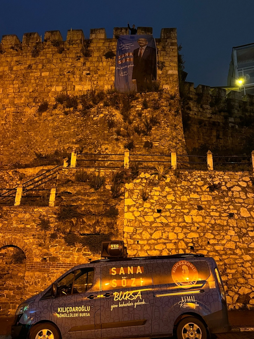 Bursa Osmangazi'de seçim çalışmaları kapsamında hisar kapısındaki surlara ve tophane surlarına CHP Genel Başkanı ve Millet İttifakı Cumhurbaşkanı Adayı Kemal Kılıçdaroğlu'nun 'sana söz baharlar gelecek' yazılı afişlerini asan Kılıçdaroğlu Gönüllüsü 5 genç sabahın erken saatlerinde gözaltına alındı. Gözaltına alınanlar arasında Kılıçdaroğlu Gönüllüleri Bursa İl Koordinatörü Aytaç Şahin’in de aralarında bulunduğu belirtildi.